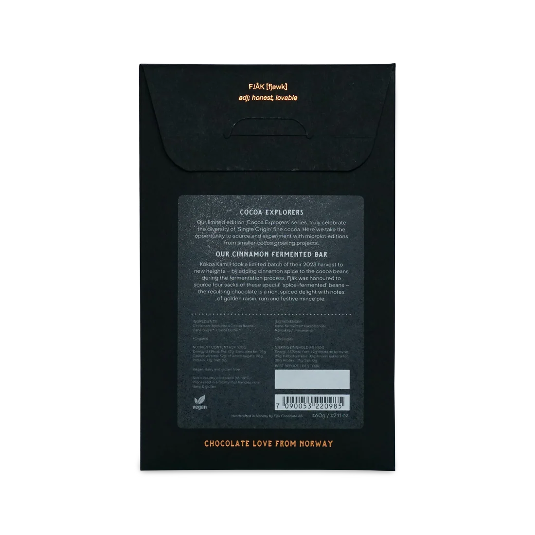 Uit de Cacao Explorers serie van Fjak. Een serie van limited editions met éxtra speciale cacoa. Dat kun je in dit geval natuurlijk bij deze kaneel-fermentatie ook ábsoluut zeggen. Fjak heeft totaal 4 zakken van deze cacao weten te bemachtigen en dat is alles. Daarmee is de prijs van deze reep ook wel duurder dan hun gewone repen. Prijzen waar we zelf ook wel even over twijfelen. We konden deze reep bovendien ook niet vooraf proeven. Maar omdat we de microlots van Fjak telkens weer zo waanzinnig goed bevielen (met als absolute hoogtepunt de waanzinnige versie met Thailand cacao – maar eigenlijk allemaal) durfden we het wel aan. En nu we geproefd hebben zijn we er, gelukkig, nog steeds blij mee. Ja, een hogere prijs, maar