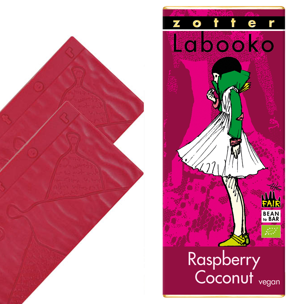 Ingrediënten: rietsuiker, cacaoboter (35%), gedroogde frambozen (9%), kokospoeder (5%:kokospasta, kokosmelk, kokosmeel), rijstdrankpoeder (rijst, zonnebloemolie, zout), kokoschips, emulgator: lecithine (soja), citroenpoeder (geconcentreerd citroensap, maïszetmeel, suiker), vanillepoeder, zout, emulgator: lecithine (zonnebloem)