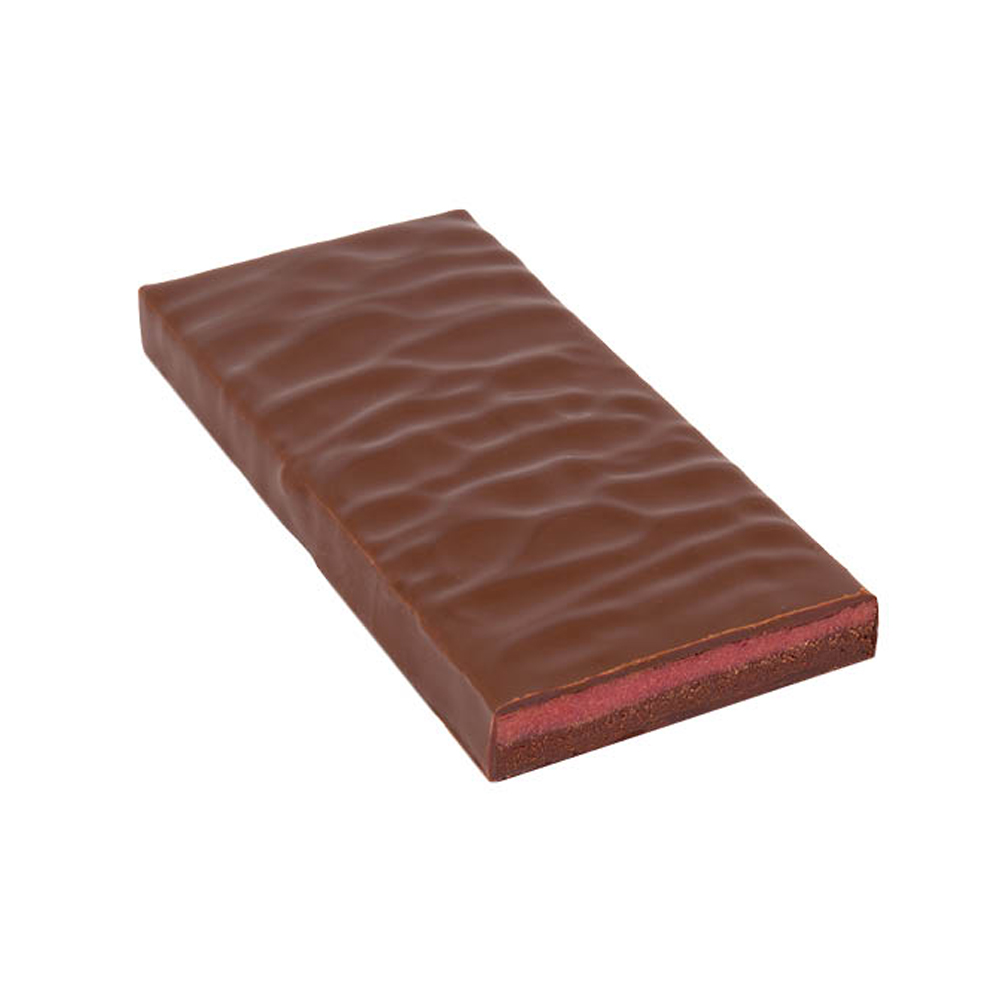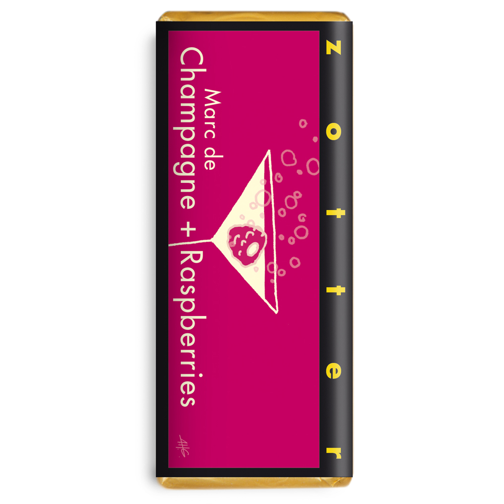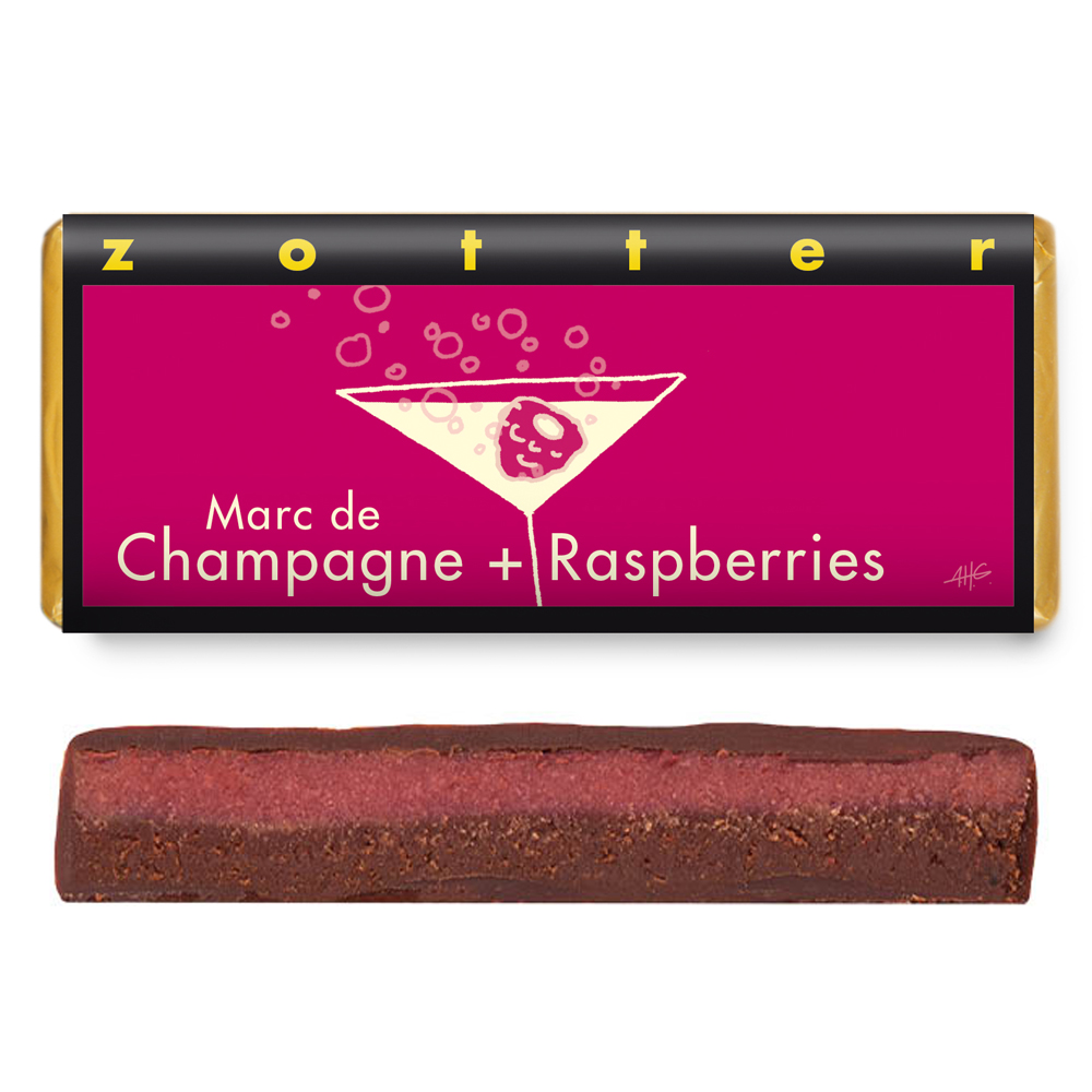 Zotter gevulde donkere chocolade met een vulling van frambozen ganache en marc de champagne ganache.