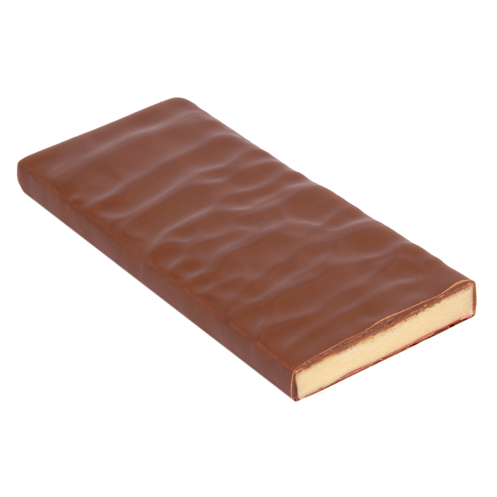 Een melkchocolade met 40% cacao, gevuld met een zoet fruitige bananenkern gemaakt van melk, honing, banaan en een snufje limoen met daaromheen een erg dun, fel rood frambozen chocolade laagje dat heerlijk bessig smaakt.