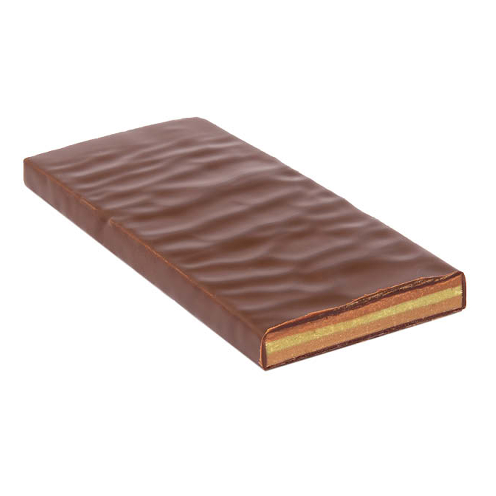 Een gevulde chocolade, een laagje pure chocolade als omhulsel voor drie lagen: